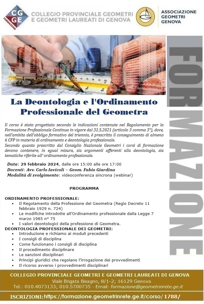 Il Collegio Geometri e G.L. di Genova organizza il corso La Deontologia e l'Ordinamento Professionale del Geometra.