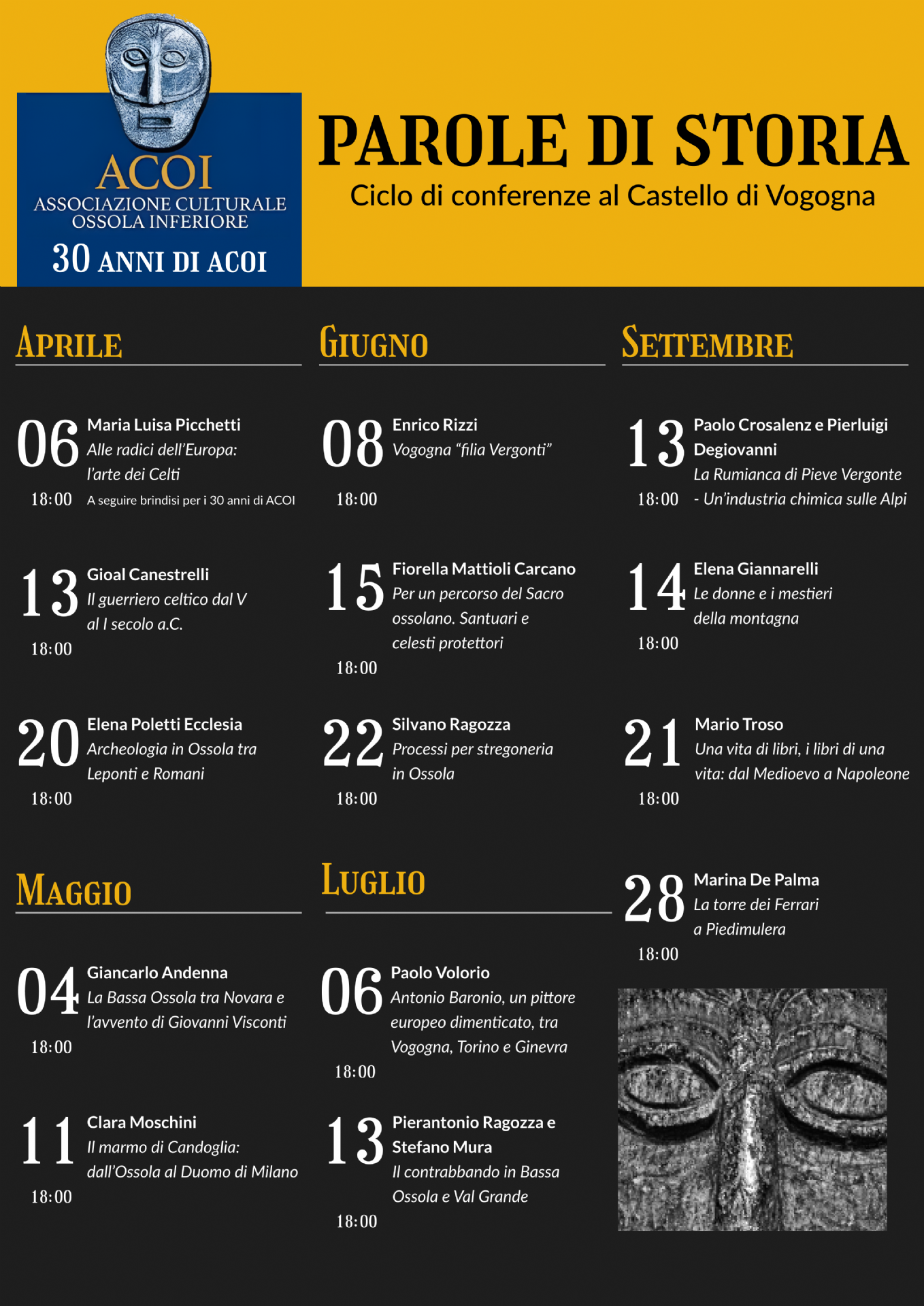 Si svolgerà nella sala del Castello Visconteo di Vogogna, ospiterà relatori e personalità d’eccezione e tratterà di STORIA: non quella che siamo soliti conoscere, ma quella fatta di approfondimenti, curiosità, riflessioni, ipotesi e resoconti.
