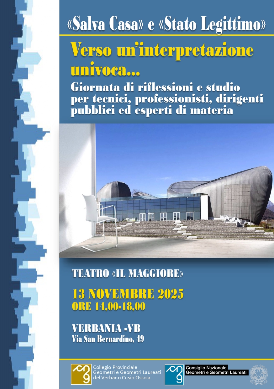 Abbiamo organizzato l'Evento dal Titolo "Salva Casa e Stato legittimo" che si terrà il giorno giovedì 13 novembre 2025 dalle ore 14.00 alle ore 18.00 presso il Teatro “Il Maggiore” di Verbania.